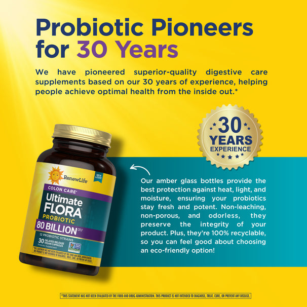 Mit 80 Milliarden lebenden Kulturen aus 12 Stämmen bietet das Ultimate Flora Colon Care Probiotic tägliche Unterstützung für den Darm und lindert gelegentliche Darmträgheit, Blähungen und Verstopfung—und fördert die Gesundheit des Immunsystems und der Atemwege.*