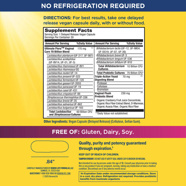 Découvrez des soins spécialisés et complets pour votre santé intime avec Ultimate Flora™ Vaginal Care Advanced Pre & Probiotic 70 Billion CFU¹ – un synbiotique végétalien à prendre une fois par jour, conçu pour soutenir la santé vaginale, digestive et globale.* Chaque capsule ciblée combine 26 souches probiotiques et postbiotiques soigneusement choisies, ainsi que des prébiotiques bénéfiques pour un soutien synbiotique complet.