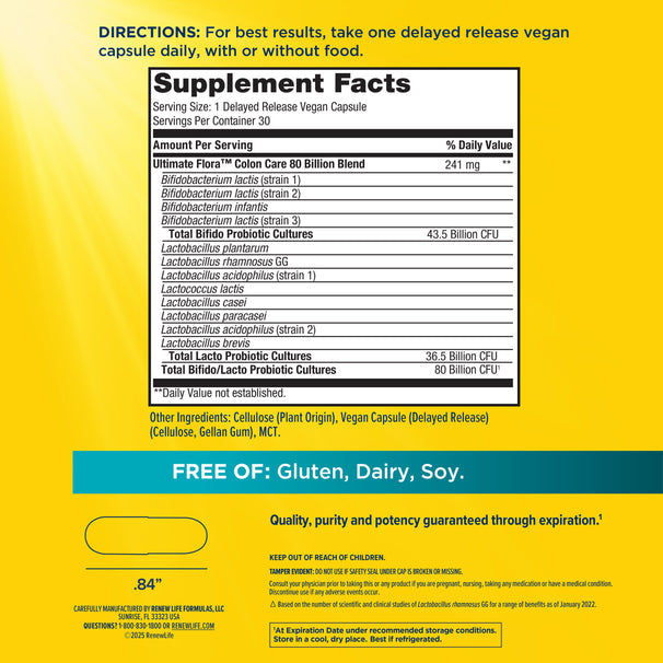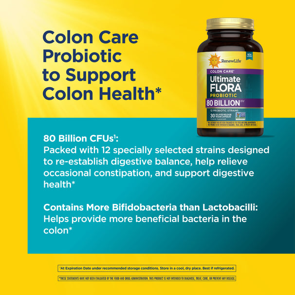 Con 80 miliardi di colture vive da 12 ceppi, Ultimate Flora Colon Care Probiotic offre supporto quotidiano per il colon e allevia l'irregolarità intestinale occasionale, il gas e la stitichezza, oltre a promuovere la salute del sistema immunitario e respiratorio.*
