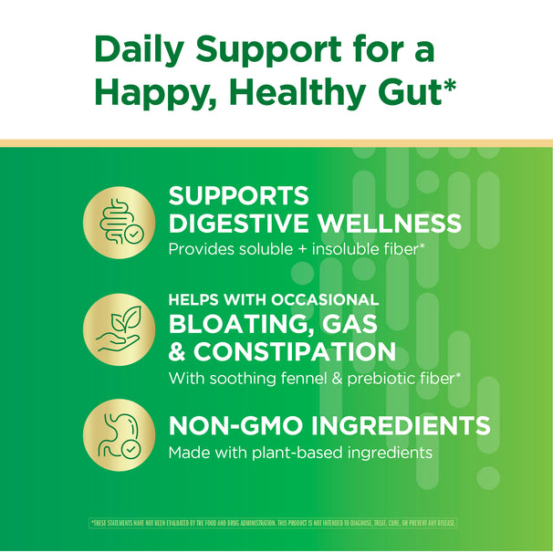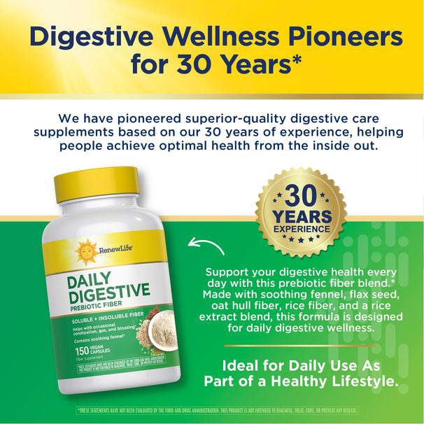 La Fibra Prebiotica Digestiva Quotidiana di Renew Life® è realizzata con una miscela di fibra solubile e insolubile e contiene finocchio lenitivo.* È disponibile in pratiche capsule vegetariane per l'uso a casa o in movimento.