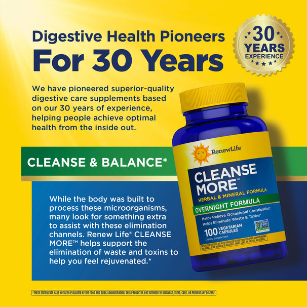 Renew Life® Cleanse More™ is designed to reset and refresh your system, working in harmony with the body’s natural detoxification process to help eliminate waste and toxins which can live in the environment, processed foods, and even in your own digestive tract. Our advanced herbal formula includes natural magnesium to help eliminate toxins, promote regularity, and relieve occasional bloating and constipation.*