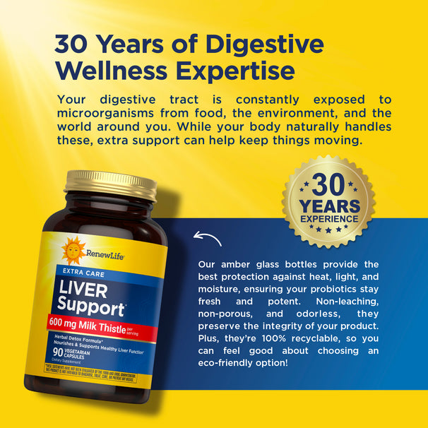 Renew Life® Extra Care Liver Support is expertly crafted to help your liver do what it does best – cleanse and balance.* Each daily serving delivers 600 mg of milk thistle extracts, with one standardized to 80% silymarin, along with potent antioxidants like vitamin C and selenium, plus an amino acid complex and herbal blend that includes artichoke extract, dandelion extract, and quercetin. Together, these ingredients help nourish and support healthy liver function, and support digestive health so you can feel refreshed from the inside out.*