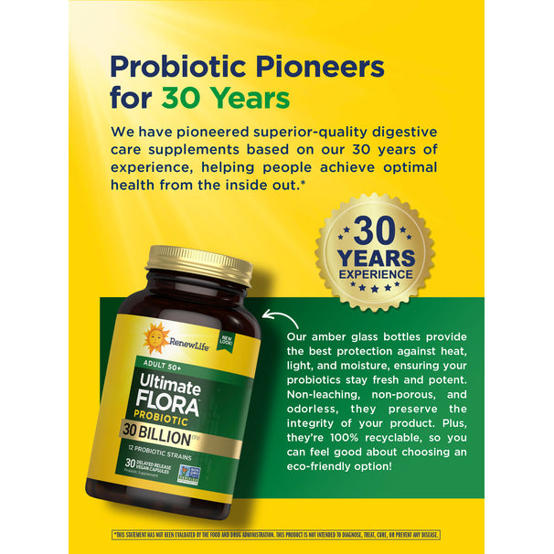 With 30 billion live cultures, Ultimate Flora Adult 50+ Probiotic seeds your gut with 12 probiotic strains to promote regularity and digestive balance—and provides bifidobacteria that decrease as you age.*
