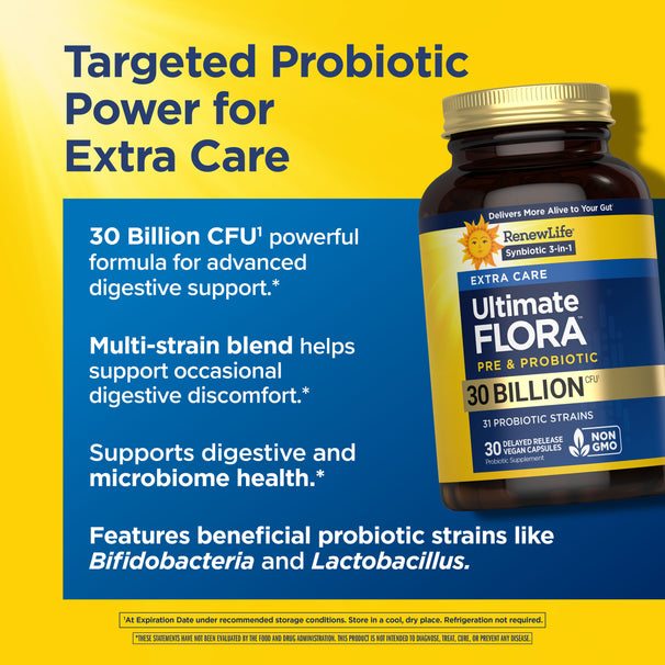 Renew Life® Ultimate Flora™ Extra Care Probiotic 30 Billion CFU1 is a great choice for those who want an above-average level of CFUs to provide digestive support.*