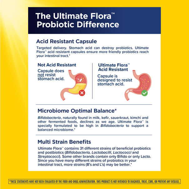 Bifidobacteria, naturally found in milk, kefir, sauerkraut, kimchi and other fermented foods, declines as we age. Bifidobacteria are abundant in the intestinal tract, offering key health benefits and aiding digestion of complex carbohydrates. Our focus on bifidobacteria, which is less common in supplements, provides balanced microbiome support compared to lactobacillus-dominant competitors. Ultimate Flora™ Men’s Once Daily Probiotic 65 Billion CFU¹ is specially formulated to contain Bifidobacteria to support a balanced microbiome.*