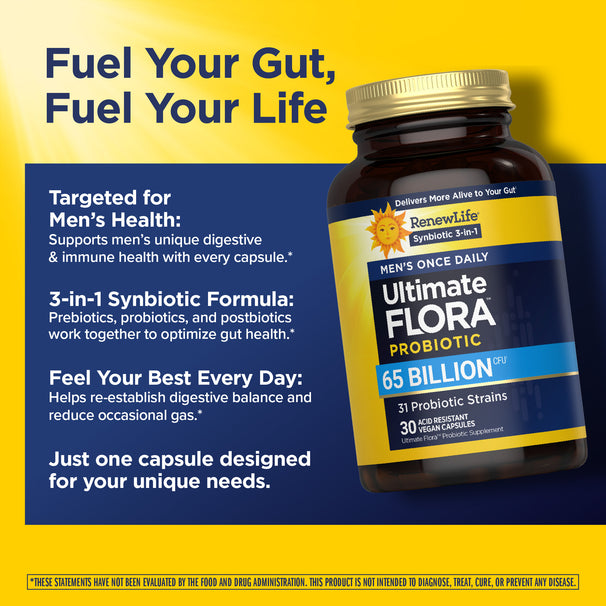 Ultimate Flora™ Men’s Once Daily gives you balanced support for a healthy gut microbiome.* Our 65 billion CFU¹ formula delivers 3-in-1 synbiotic support from prebiotics, probiotics, and postbiotics for overall wellness, in just one delayed-release vegan capsule a day.* It helps reestablish digestive balance while supporting immune and colon health.*