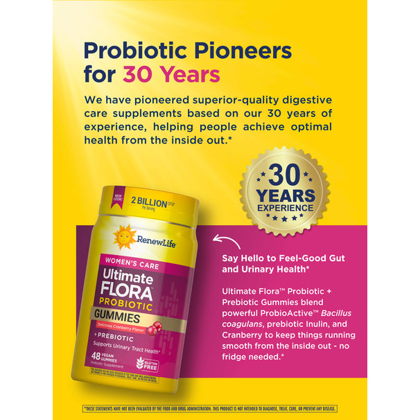 Designed for women, crafted for real life. Ultimate Flora™ Women's Care Probiotic Gummies are thoughtfully formulated to meet the unique health needs of women, offering targeted support for digestive and urinary tract health.*  With shelf-stable ProbioActive™ Bacillus coagulans, prebiotic Inulin, and Cranberry, these delicious cranberry flavored gummies provide gentle daily support for women.