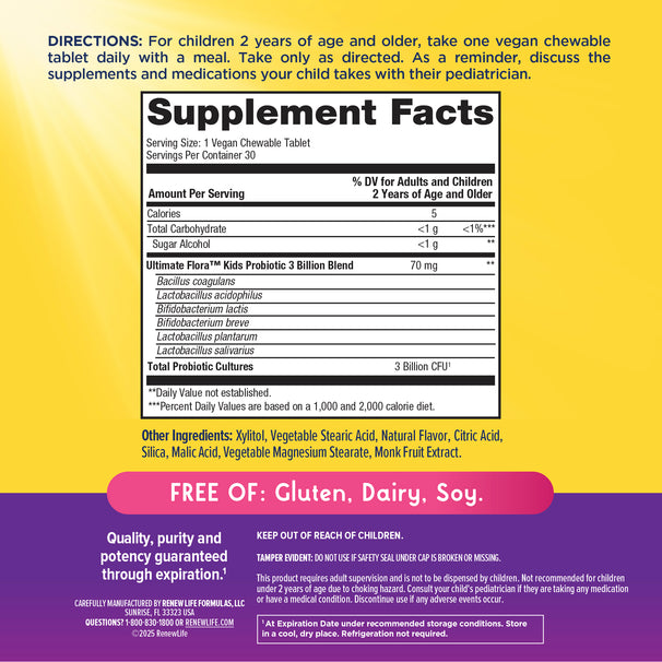 Ultimate Flora™ Kids Probiotic Chewables contain 3 Billion CFU¹, and are a great choice for supporting your child’s digestive and immune health.*