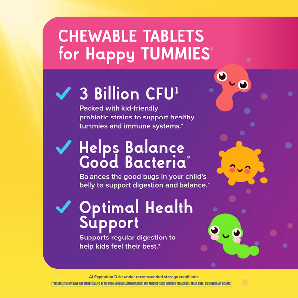Chewable tablets are just another delivery mode for probiotics. Whether your child prefers Ultimate Flora™ probiotics in gummy or chewable caplet form, they will get the CFU dose listed on the label. Like all our probiotics, Ultimate Flora™ Kids Probiotic Chewables are made to support healthy digestion.*